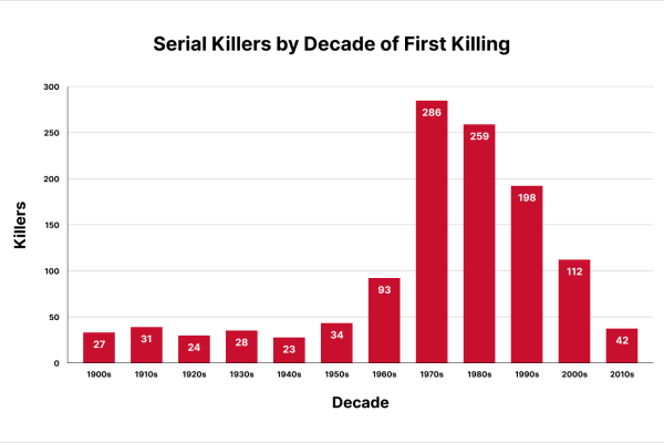 (L) Nisu nestali. Da, mislim da su serijski ubojice oduvijek postojale. Na grafikonu piše "Serijski ubojice po deceniju prvog ubojstva“. Ali oni ne mogu sa sigurnošću to znati. To se zasniva samo na onome što im je poznato. A postoji mnogo toga što ne znaju.